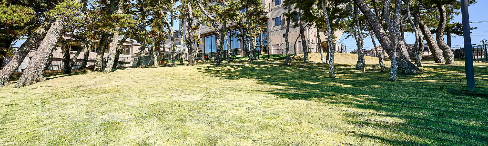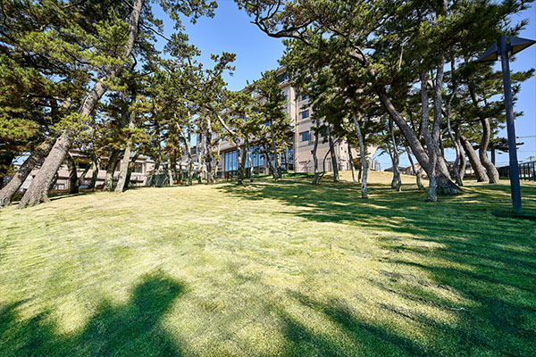 広々とした芝生が広がる開放的な空間で自然な傾斜を愛犬が思いきり走って遊べる設計です。ドッグパーク内には風情ある松の木が点在し、直射日光をやわらげる天然のシェードとしても機能します。快適さと自然との調和を大切にした、愛犬との豊かな時間をお楽しみください。