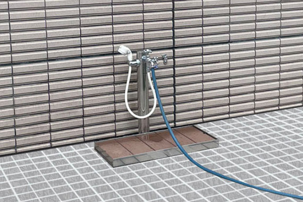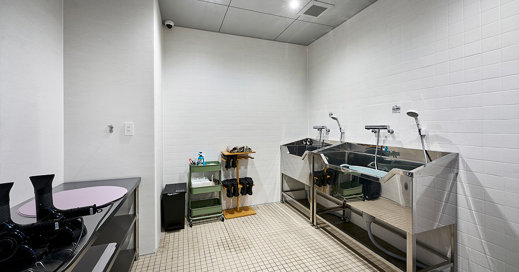 ワンちゃん専用の洗い場には、使いやすいシャワー設備と温度調整ができる水栓を備えております。足元の泥汚れから全身の洗浄まで、快適にご利用いただけるスペースです。