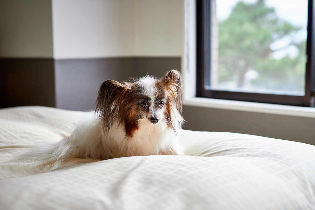 愛犬が安心してくつろげるよう、ベッドの上で一緒に過ごしていただけます。ただし、粗相や毛汚れなどが生じた場合はクリーニング費用をお願いする場合がございます。愛犬専用のベッドもございますので、普段通り落ち着ける場所としてぜひご利用ください。